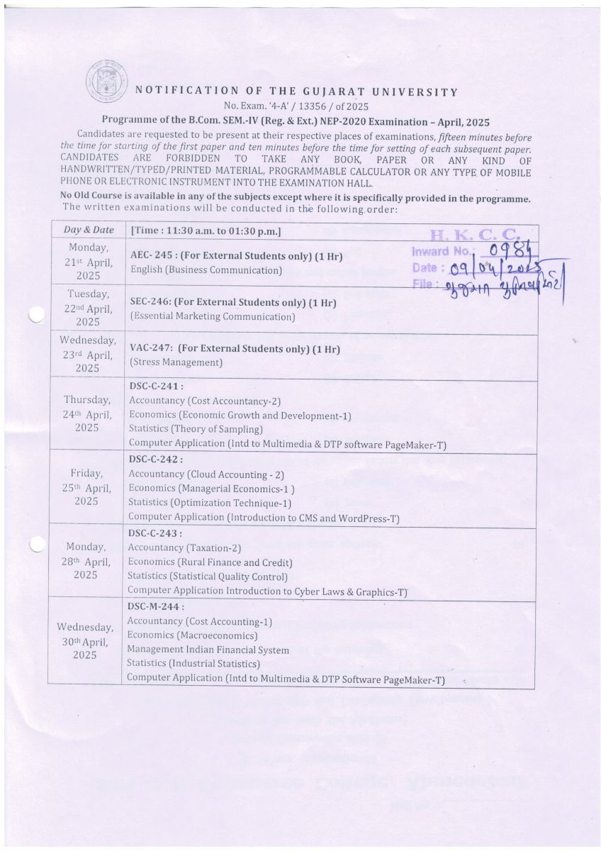 GUJARAT UNIVERSITY MCOM SEM -IV (Reg & Ext) OFFLINE EXAMINATION TIME TABLE 27-07-2021