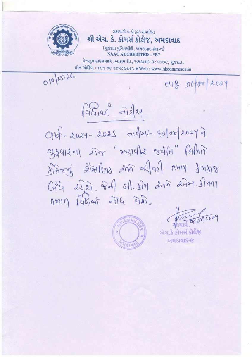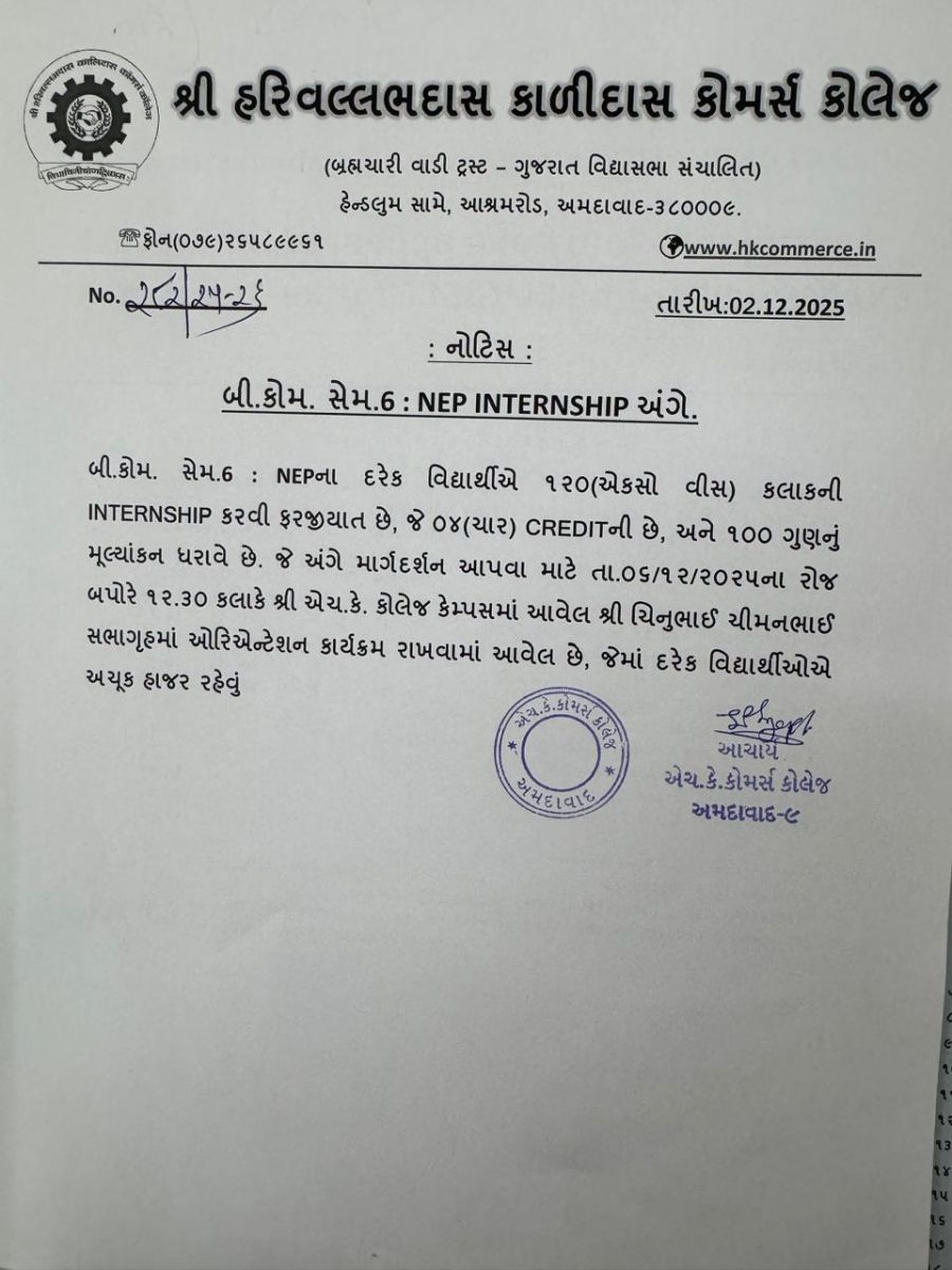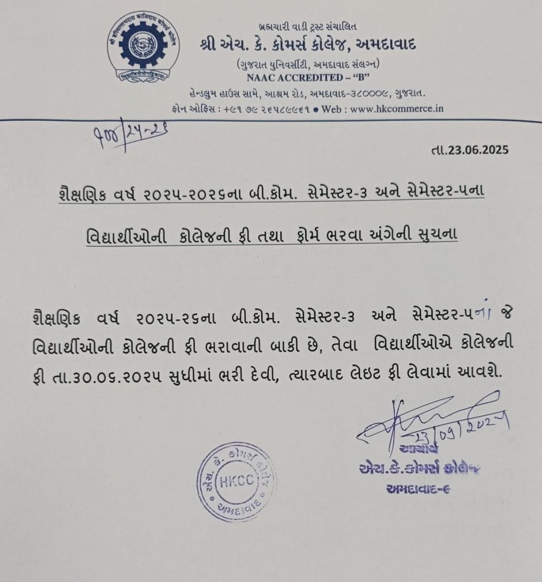 બી.કોમ. સેમે 2ના વિદ્યાર્થીઓની કોલેજની ફી લેઈટ ફી સાથે જમા કરાવવા અંગેની અગત્યની સૂચના