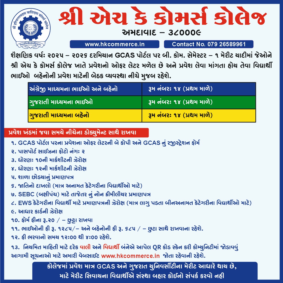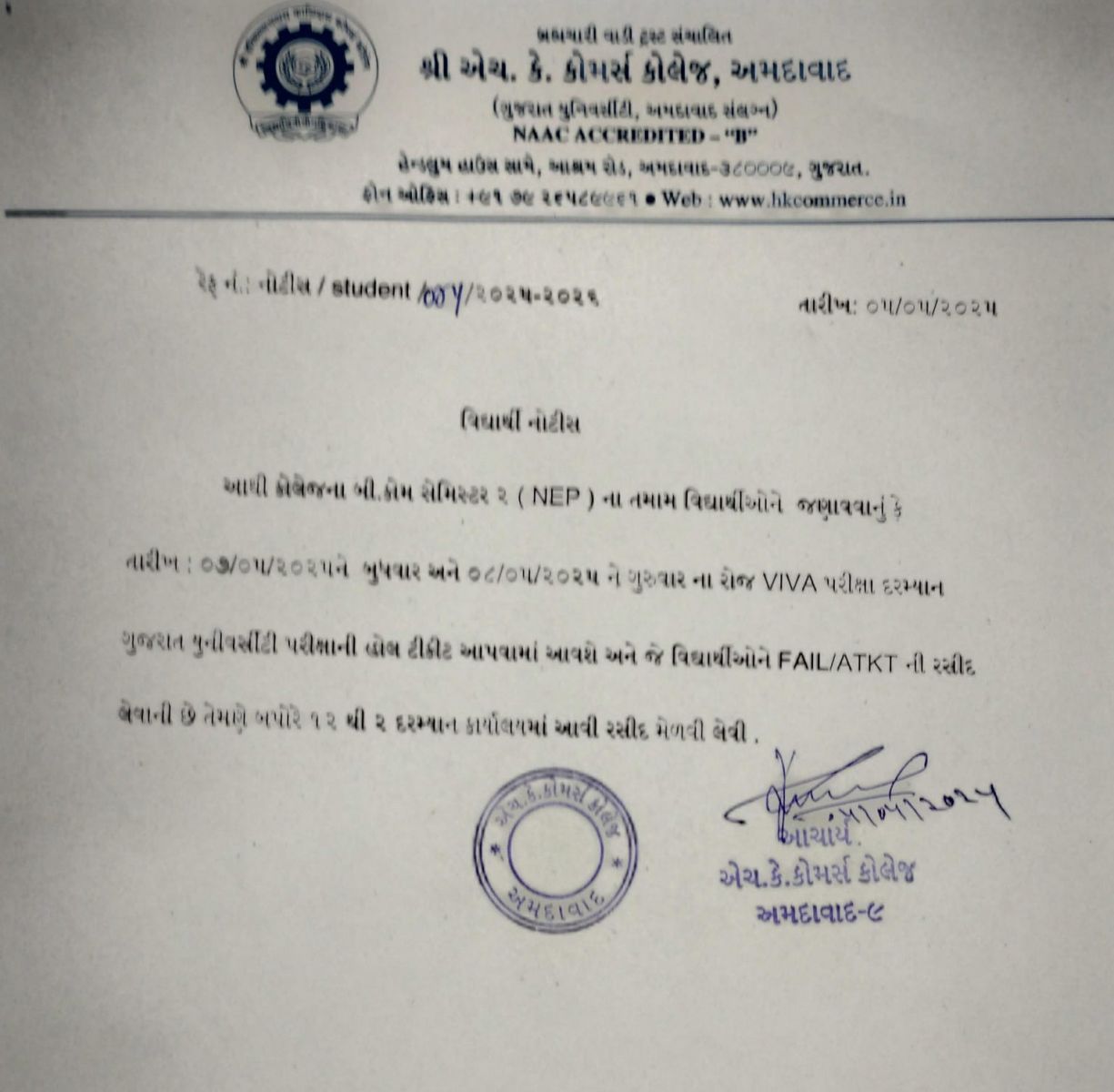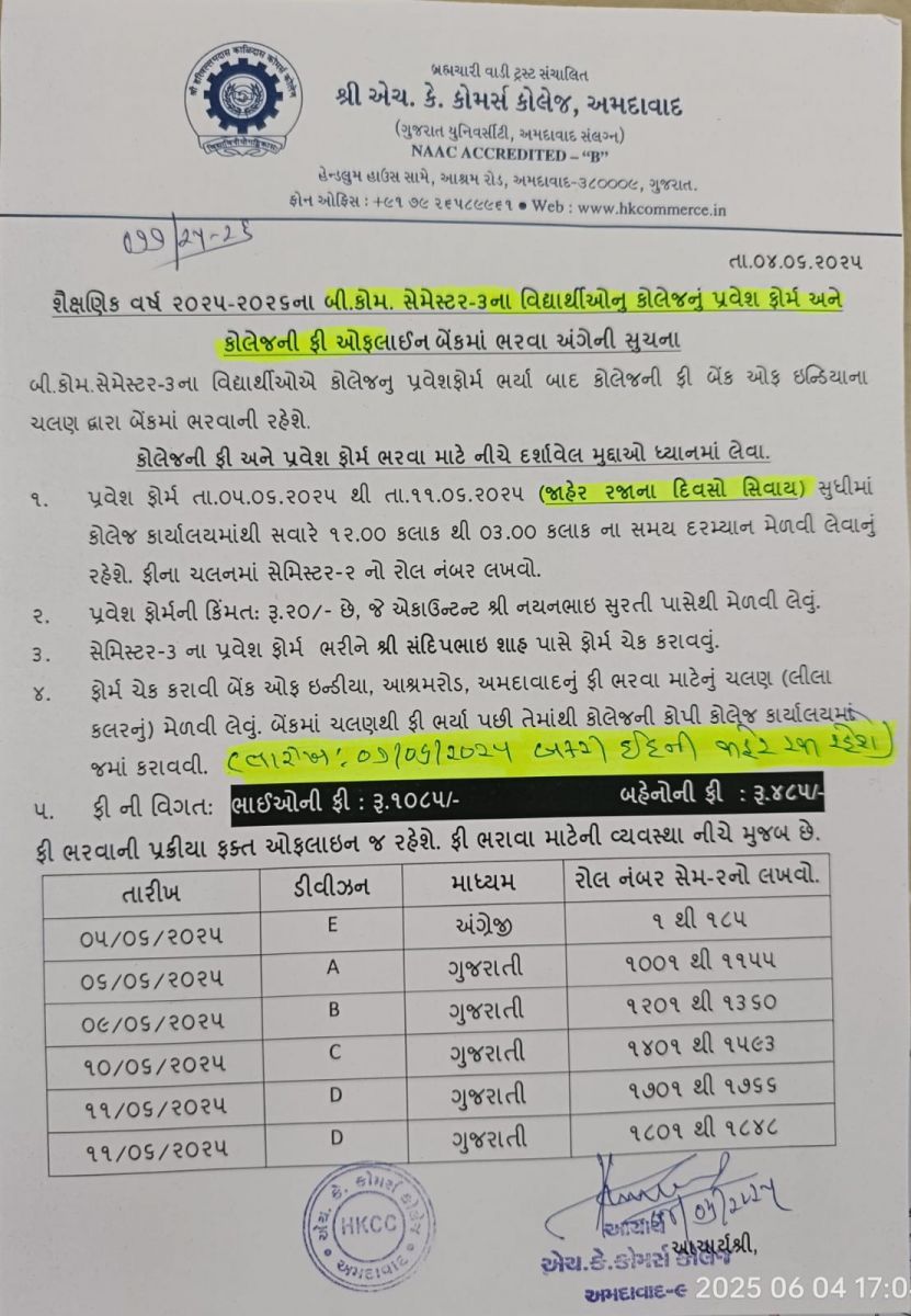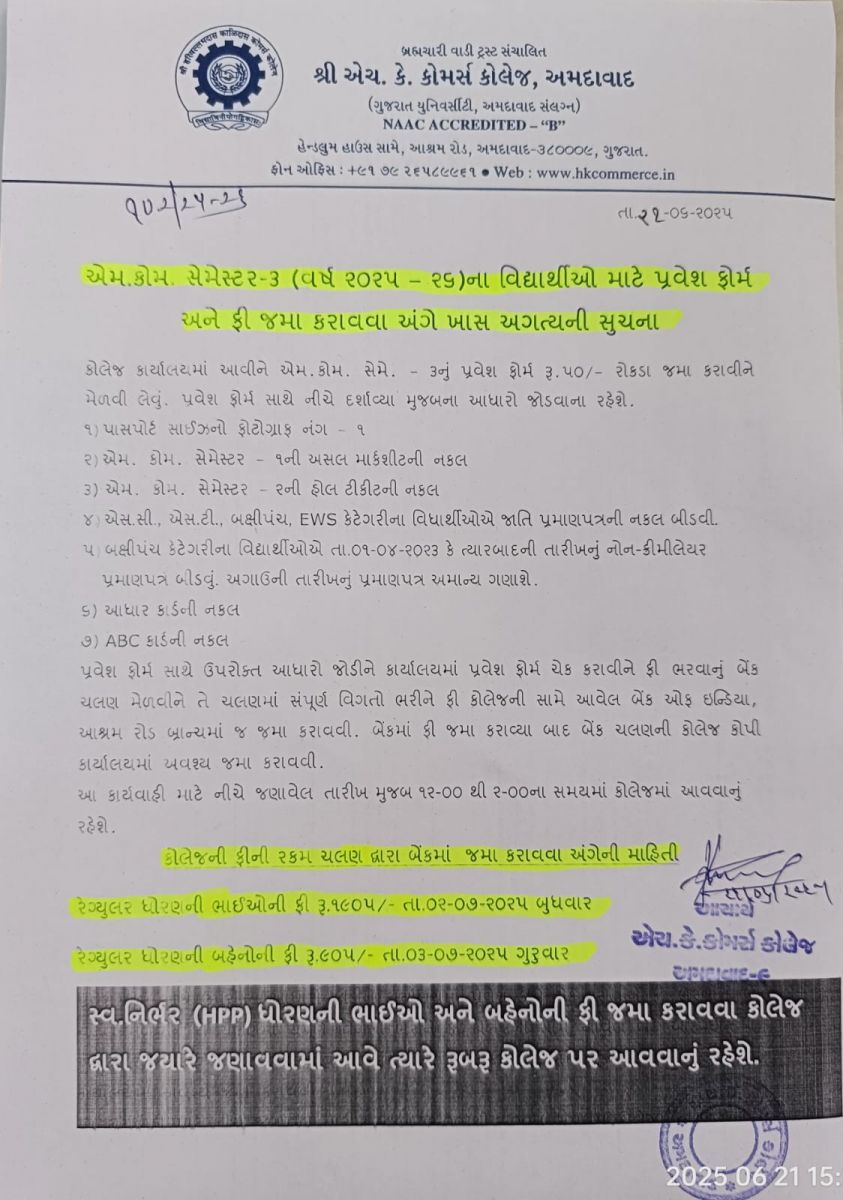 પ્રવેશ ફોર્મ અને ફી ચલણ કોલેજ પરથી મેળવી