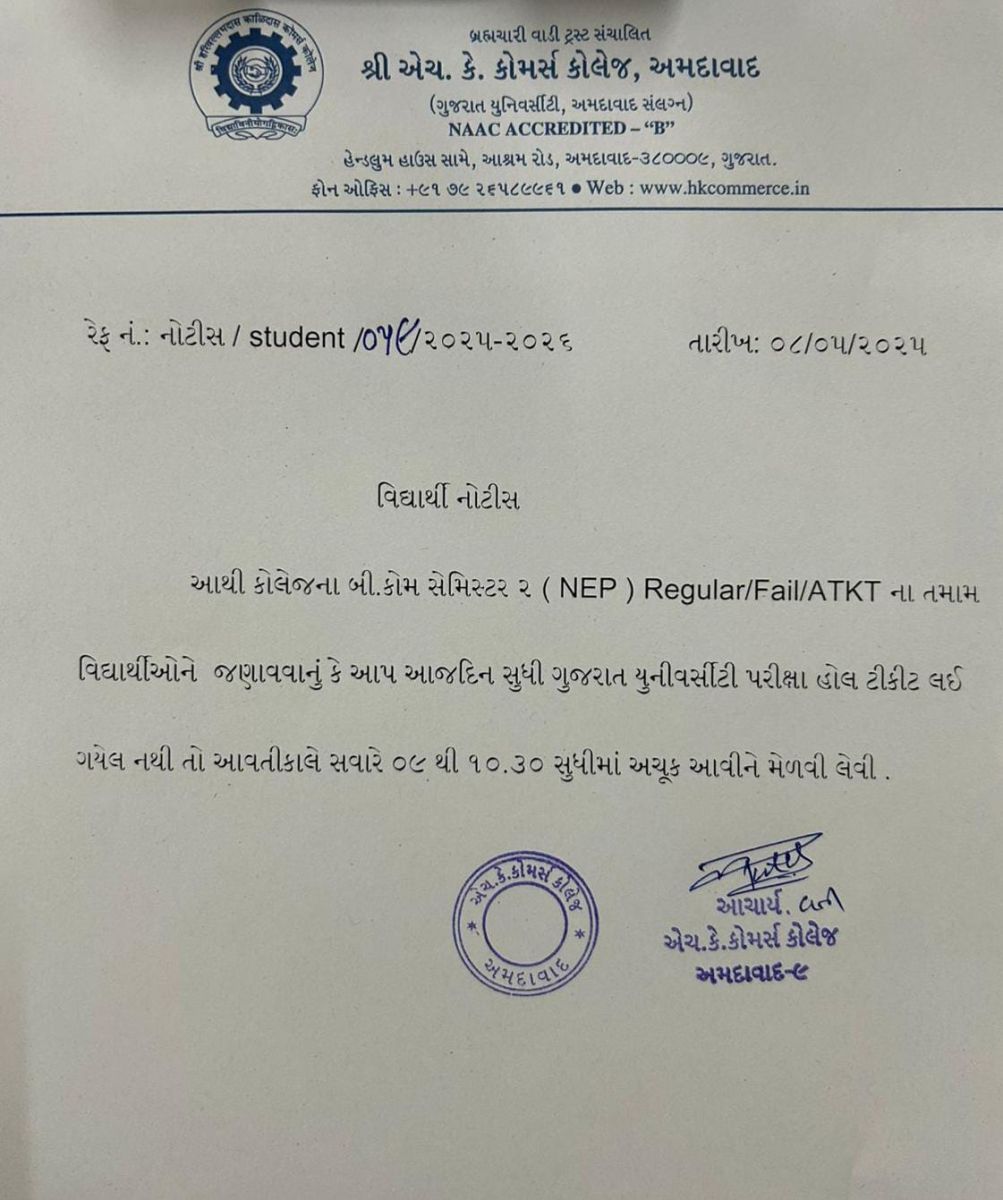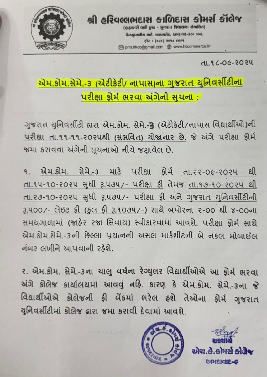 બી.કોમ/એમ.કોમ. સેમે.2 એટીકેટી ગુજ.યુનિ.ના પરીક્ષા ફોર્મ લેઈટ ફી સાથે ભરવા અંગેની સૂચના