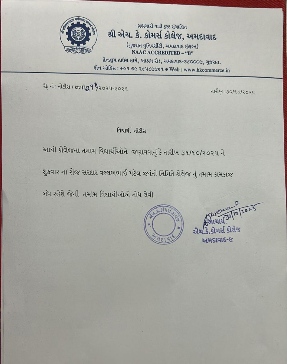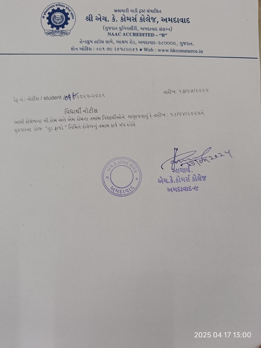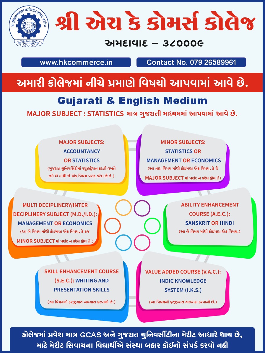 Shri Harivallabhadas Kalidas Commerce College is the offspring of Gujarat Vidhyasabha and a late one at that. Established in 1968, it was supposed to cater to the rising need for commerce education in a changing society. Gujarat Vidhyasabha was the brain child of a British officer by the name of Sir Alexander Kinlock Forbes who embarked on the mission of enriching the vernacular (the Gujarati) language.