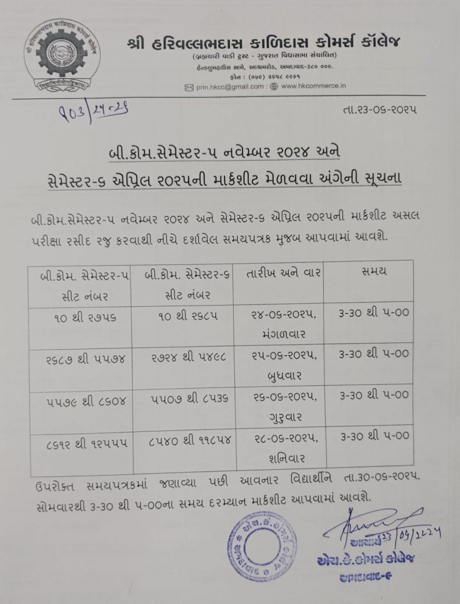 બી.કોમ. સેમેસ્ટર 6 ના વિદ્યાર્થીઓ માટે ગુજ. યુનિ.ની સપ્ટેમ્બર 2020ની માર્કશીટ મેળવવા અંગેની સૂચના