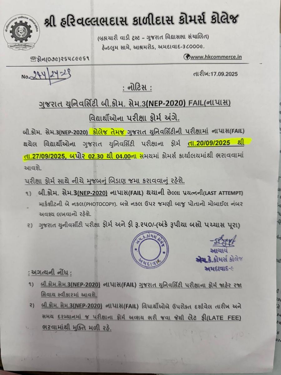 NOTICE FOR B.COM. & M.COM. SAM-2 (ATKT) GUJARAT UNIVERSITY EXAM FORM SUBMISSION LAST DATE 7/7/2021