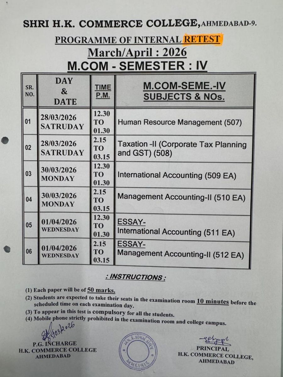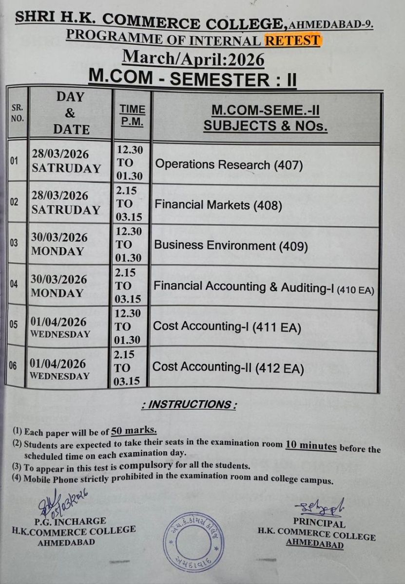બી. કોમ. સેમ. – ૫ અને એમ. કોમ. સેમ. – ૩ યુનીવર્સીટી પરીક્ષા આપવા માંગતા વિદ્યાર્થીઓ માટે પસંદ કરવાન
