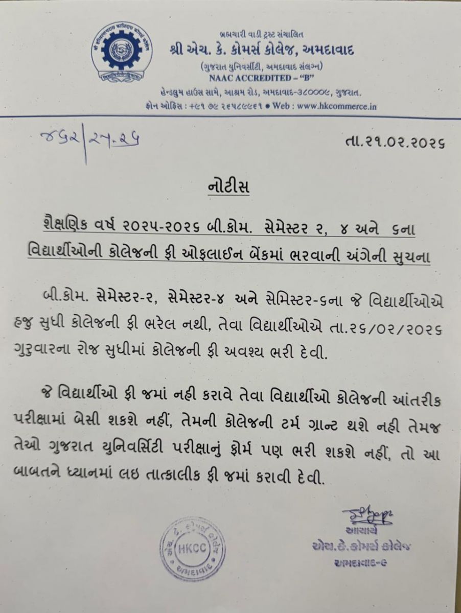 બી.કોમ. સેમે 2ના વિદ્યાર્થીઓની કોલેજની ફી લેઈટ ફી સાથે જમા કરાવવા અંગેની અગત્યની સૂચના