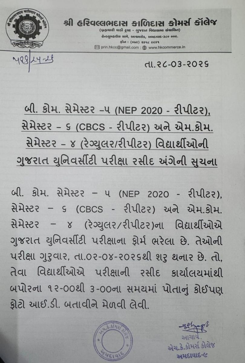 બી.કોમ/એમ.કોમ. સેમે.2 એટીકેટી ગુજ.યુનિ.ના પરીક્ષા ફોર્મ લેઈટ ફી સાથે ભરવા અંગેની સૂચના