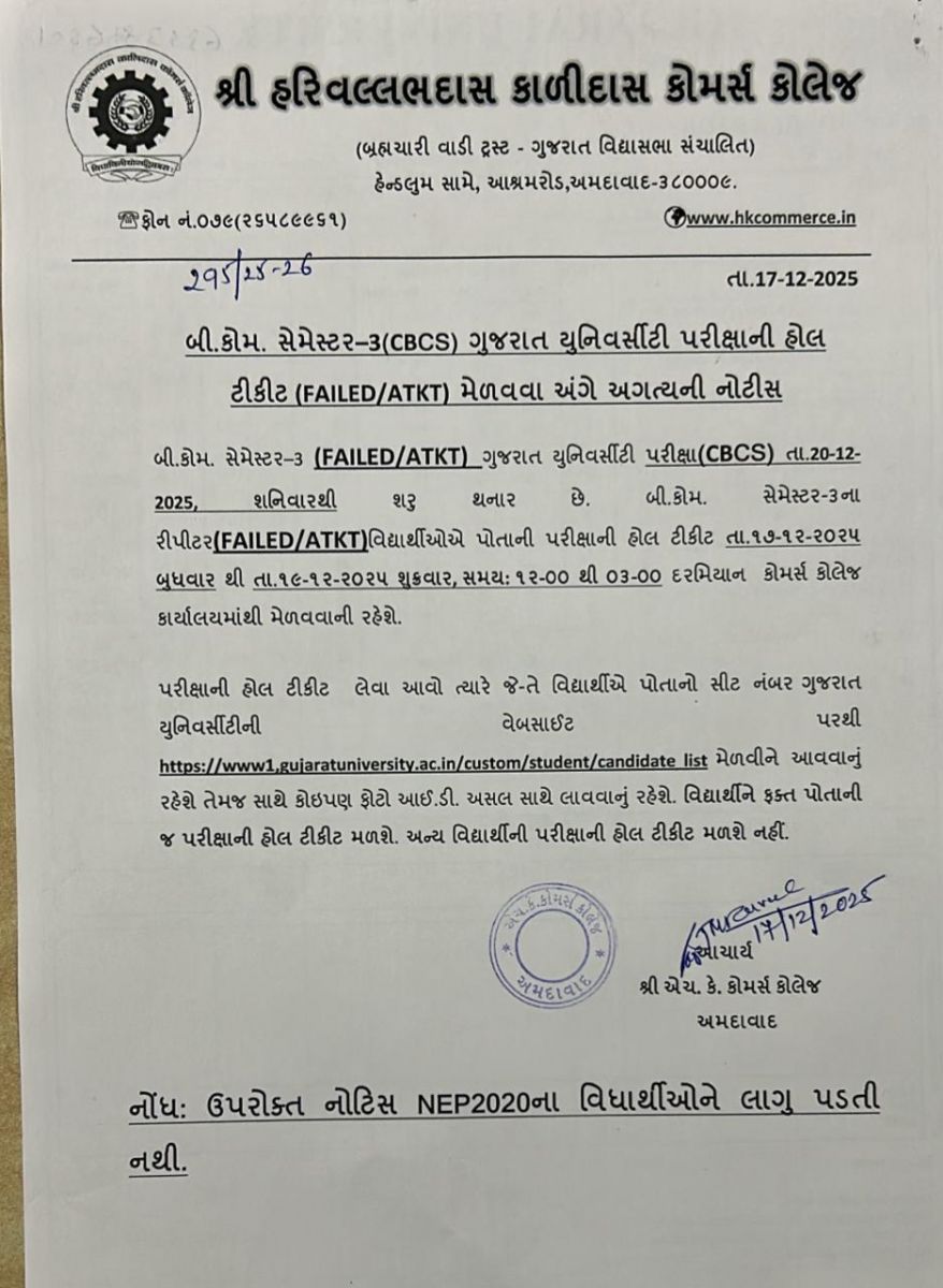 બી.કોમ/એમ.કોમ. સેમે.2 એટીકેટી ગુજ.યુનિ.ના પરીક્ષા ફોર્મ લેઈટ ફી સાથે ભરવા અંગેની સૂચના